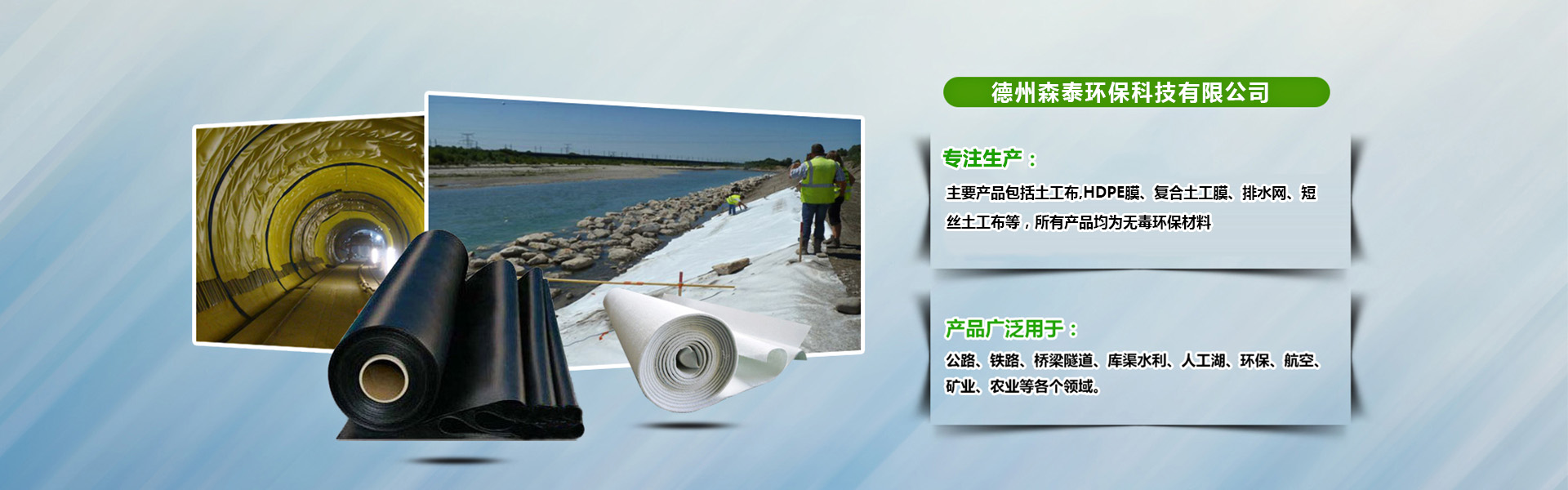 德州泰环保U技有限公司Q森泰环保专注于水利、环境及(qing)生态修复技术研发及(qing)产品刉,q有专业的施工工E技术服务团队。已完成水利工程100多项Q环境工E?00多项Q典型工E包括南水北调工E、三峡工E、߀沱河防渗工程Q保定环城水pdE、济南垃圑֡埋场工程Q桂林垃圑֡埋场工程、大同电(sh)厂防渗工E、嘉兴火车站防渗工程、黑龙江农垦防渗工程{。森泰环保主要品包括土工布,HDPE膜、复合土工膜、排水网、短丝土工布{,所有品均为无毒环保材料,可广泛应用于Q?.环境修复工程Q粮食基地土壤改良、工业场地、矿业、水体等工程、蔬菜大?LQ种植等Q?.水利工程Q江x库、堤坝的防渗加固、水渠的防渗、护坡等Q及(qing)市政防渗Q地铁、徏{物的地下工E、种植屋面、屋花园的防渗、污水管道内衬等Q?.....
